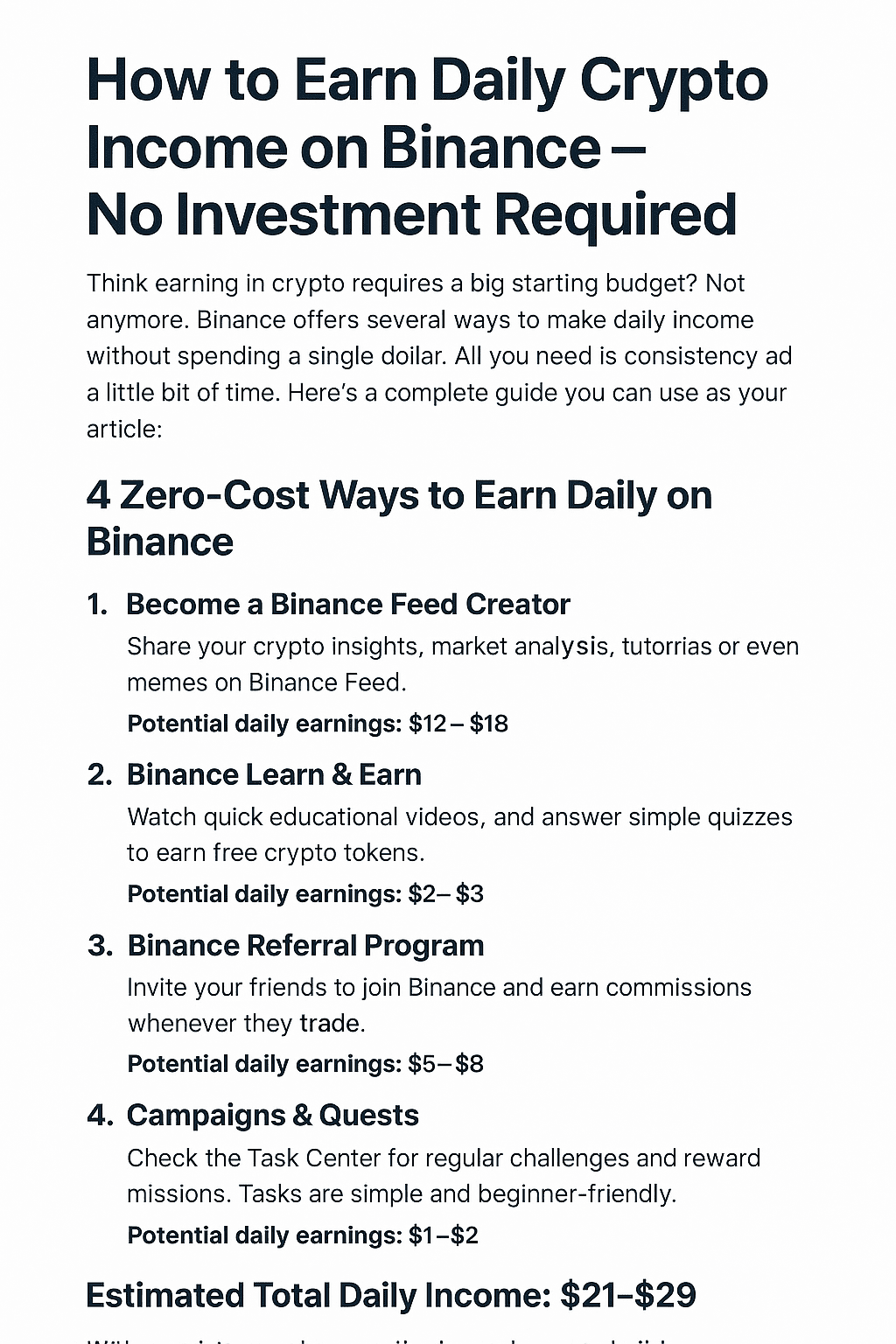 Pensi che guadagnare in crypto richieda un grande budget iniziale? Non più. Binance offre diversi modi per guadagnare un reddito giornaliero senza spendere un singolo dollaro. Tutto ciò di cui hai bisogno è coerenza e un po' di tempo. Ecco una guida completa che puoi usare come articolo: