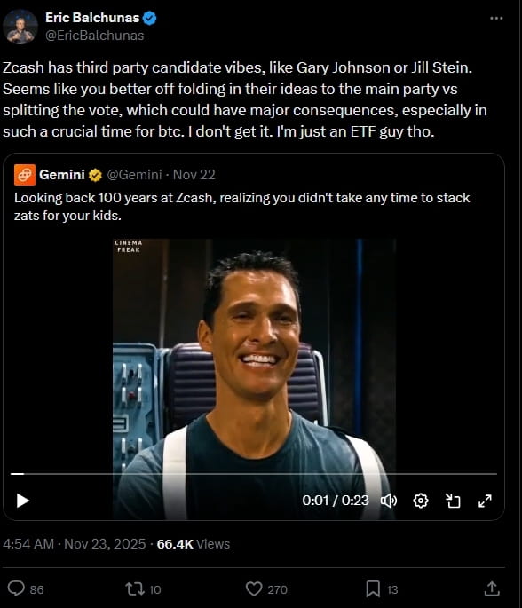Balchunas ha paragonato Zcash a un candidato di terze parti, suggerendo che promuovere una moneta di privacy separata potrebbe diluire l'inerzia culturale e politica di Bitcoin nella lotta cripto negli Stati Uniti.