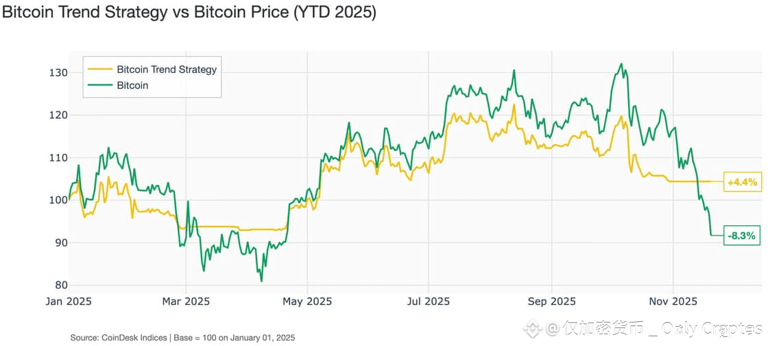 Speaking of trend, it is turning out to be a savior of 2025 performance. Our Bitcoin Trend Indicator (BTI), launched in March 2023, uses a quartet of moving average crossover signals to indicate the presence and strength of trend in the price of bitcoin. It has indicated "Significant Downtrend" for 24 days. Our clients have implemented several strategies based on BTI to allocate to — and away — from bitcoin. The YTD performance of one of those appears below.