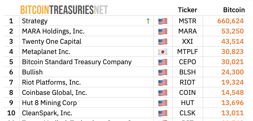 Twenty One Capital è tra i maggiori detentori di Bitcoin tra le aziende pubbliche. Possiede oltre 43.500 Bitcoin, il cui valore supera i $4 miliardi. Secondo Bitcoin Treasuries, questo è il terzo più grande stock di Bitcoin tra le aziende pubbliche, dopo il miner MARA Holdings.