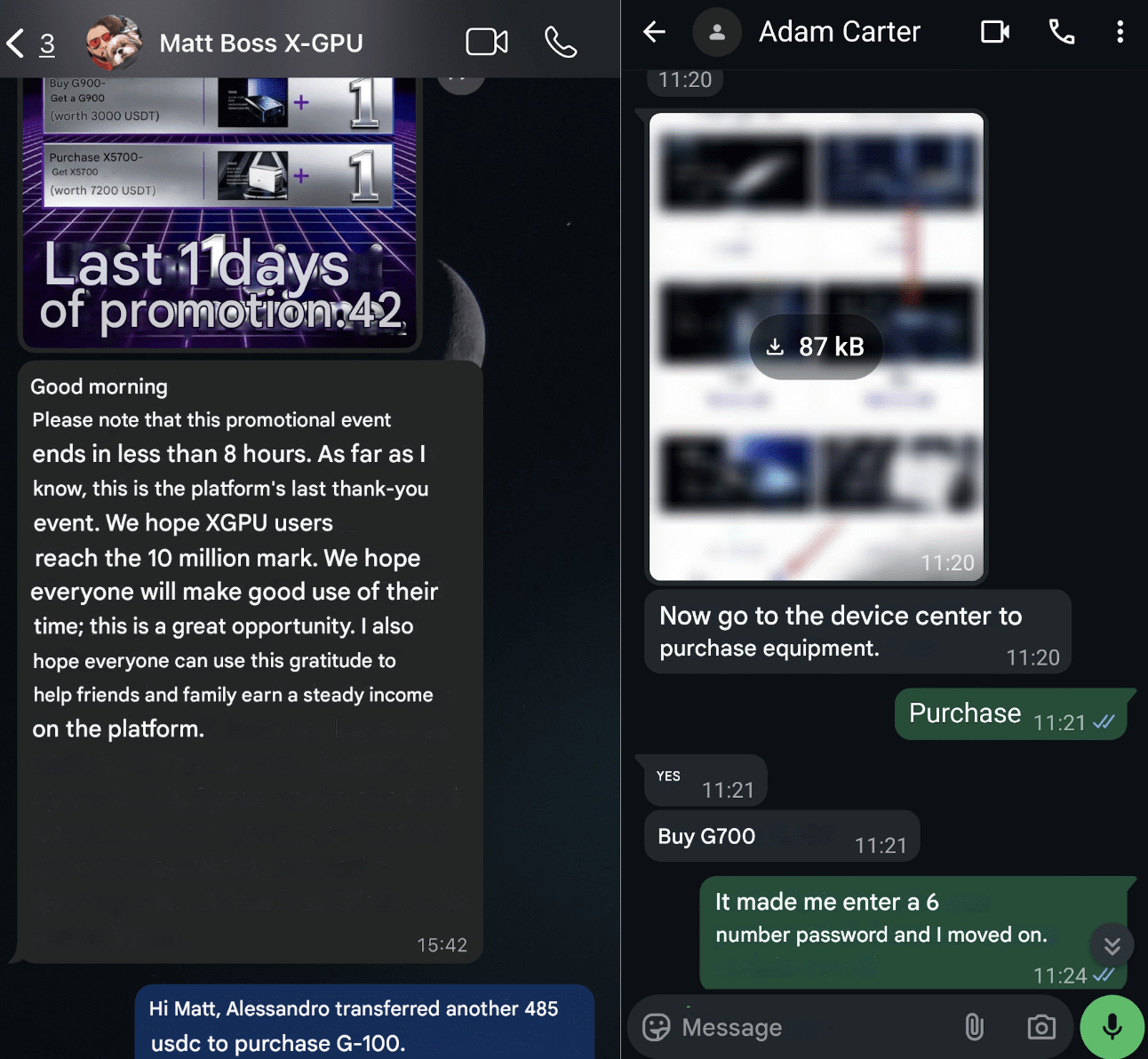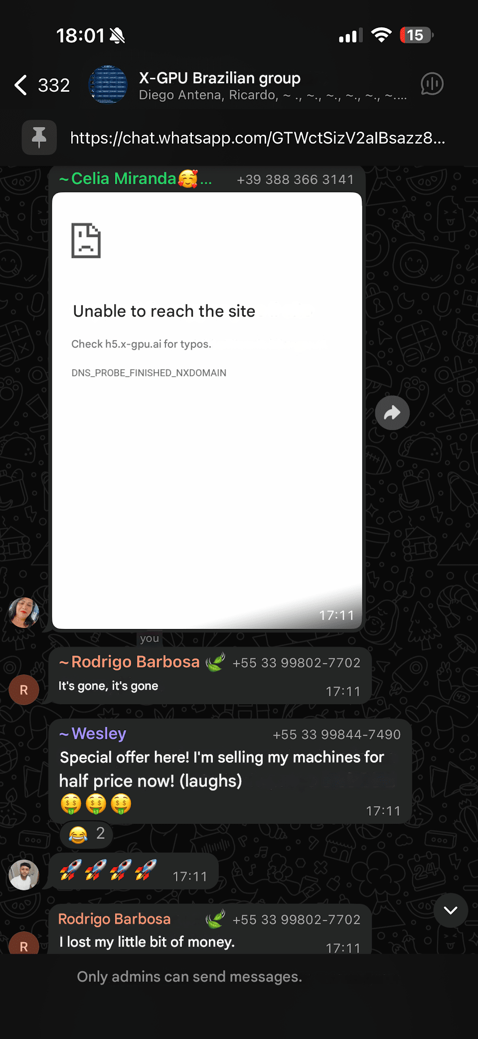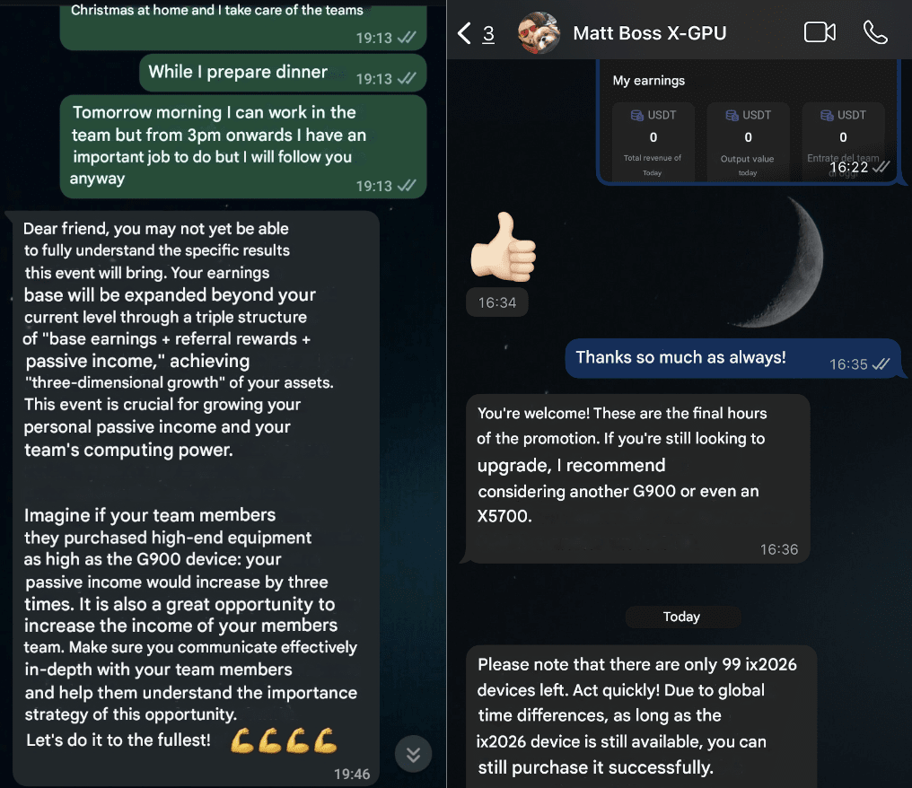 1. Le vittime vengono attirate tramite gruppi WhatsApp/Telegram con “promozioni a tempo limitato” e enormi promesse di ROI.