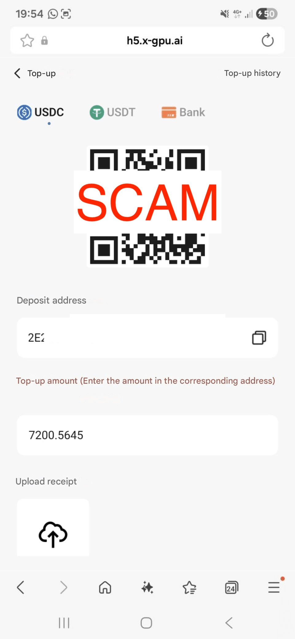 2. Gli utenti sono indirizzati a x-gpu.ai per “acquistare” dispositivi di mining virtuale utilizzando USDT/USDC (tramite codice QR o indirizzo on-chain).