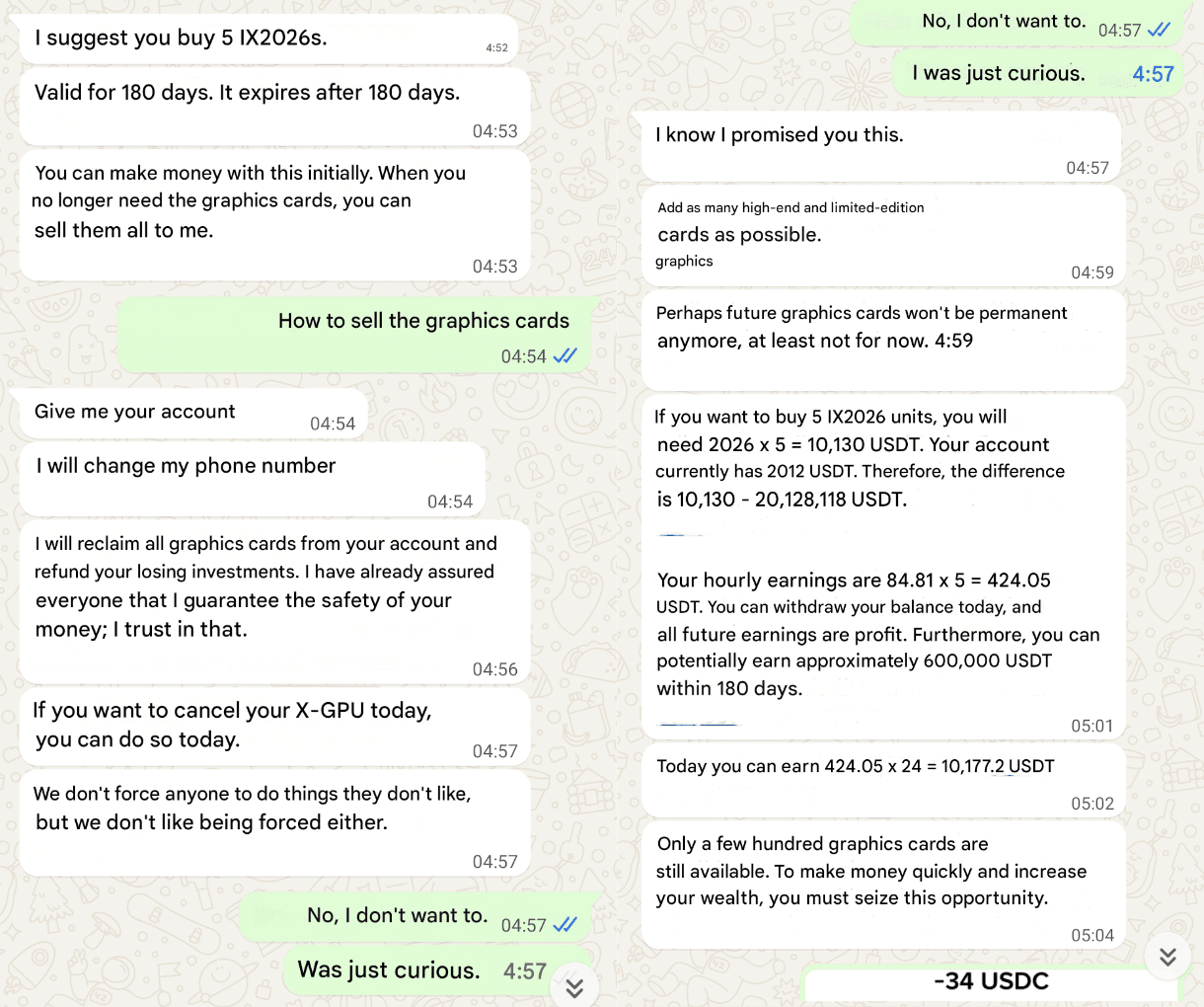 I truffatori stanno conducendo una truffa elaborata che si descrive come una piattaforma di mining virtuale in grado di generare alti ritorni di profitto. Le vittime vengono attratte nel sito della truffa; “https://h5.x-gpu.ai”, promettendo persino un enorme reddito passivo acquistando macchine da mining “virtual X-GPU/G900/iX2026”. Ma la realtà è che è tutto un inganno per attirare le vittime a depositare i propri fondi nella piattaforma truffaldina.