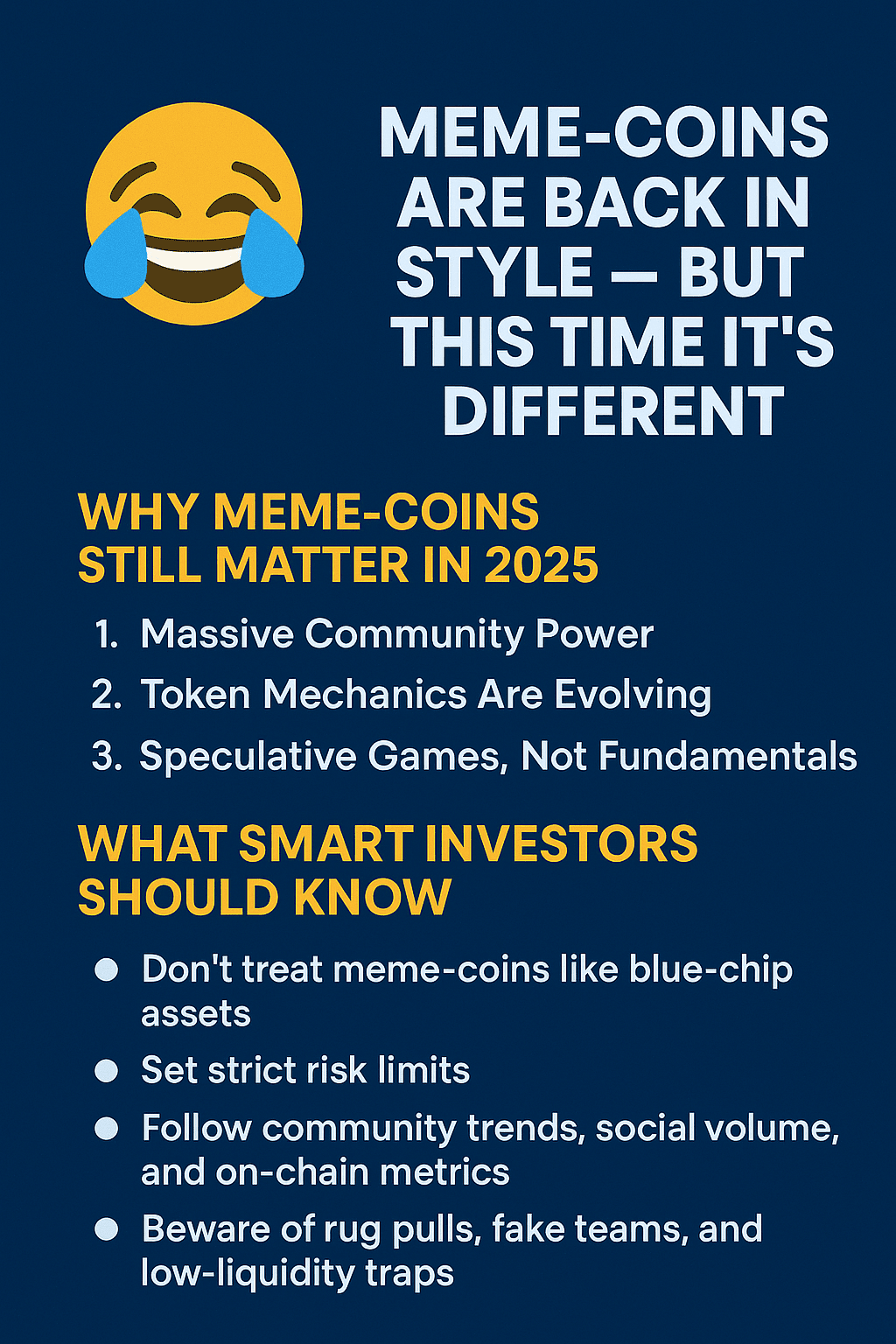 Ma prima di tuffarti — sappi questo: investire in meme-coin non è per i deboli di cuore. È ad alto rischio, alta ricompensa — e vale solo una fetta di una strategia equilibrata.