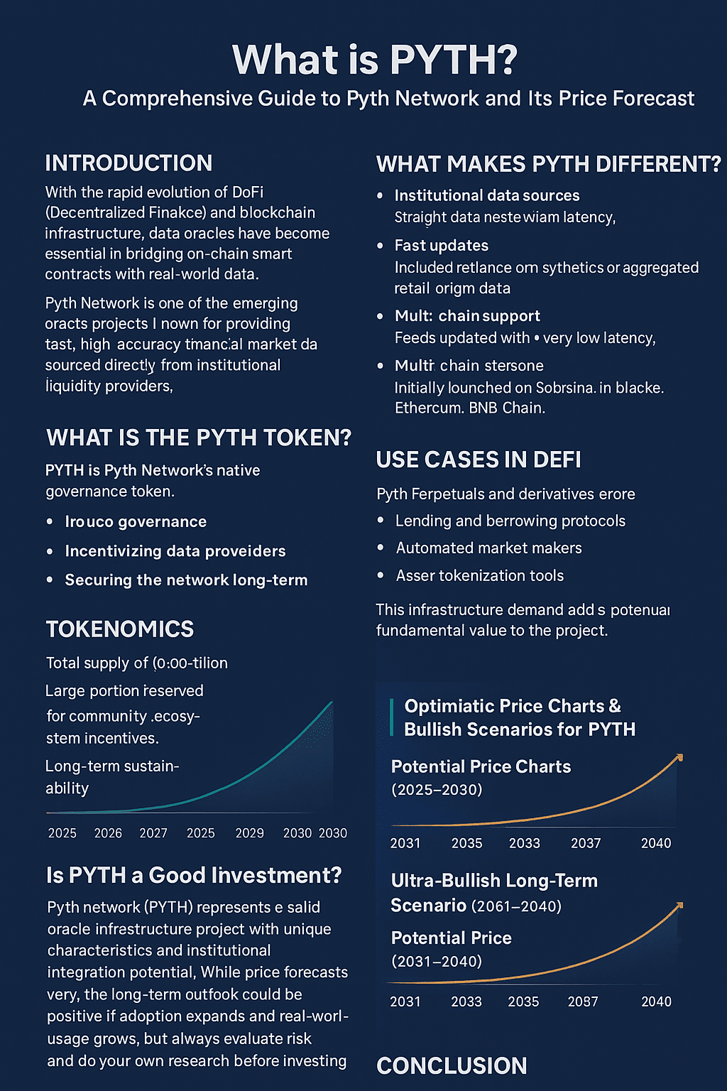 I modelli prevedono che PYTH possa essere scambiato intorno a $0.07–$0.11 entro il 2025–2026 in uno scenario di crescita moderata, assumendo un uso più ampio di DeFi e l'adozione della blockchain.