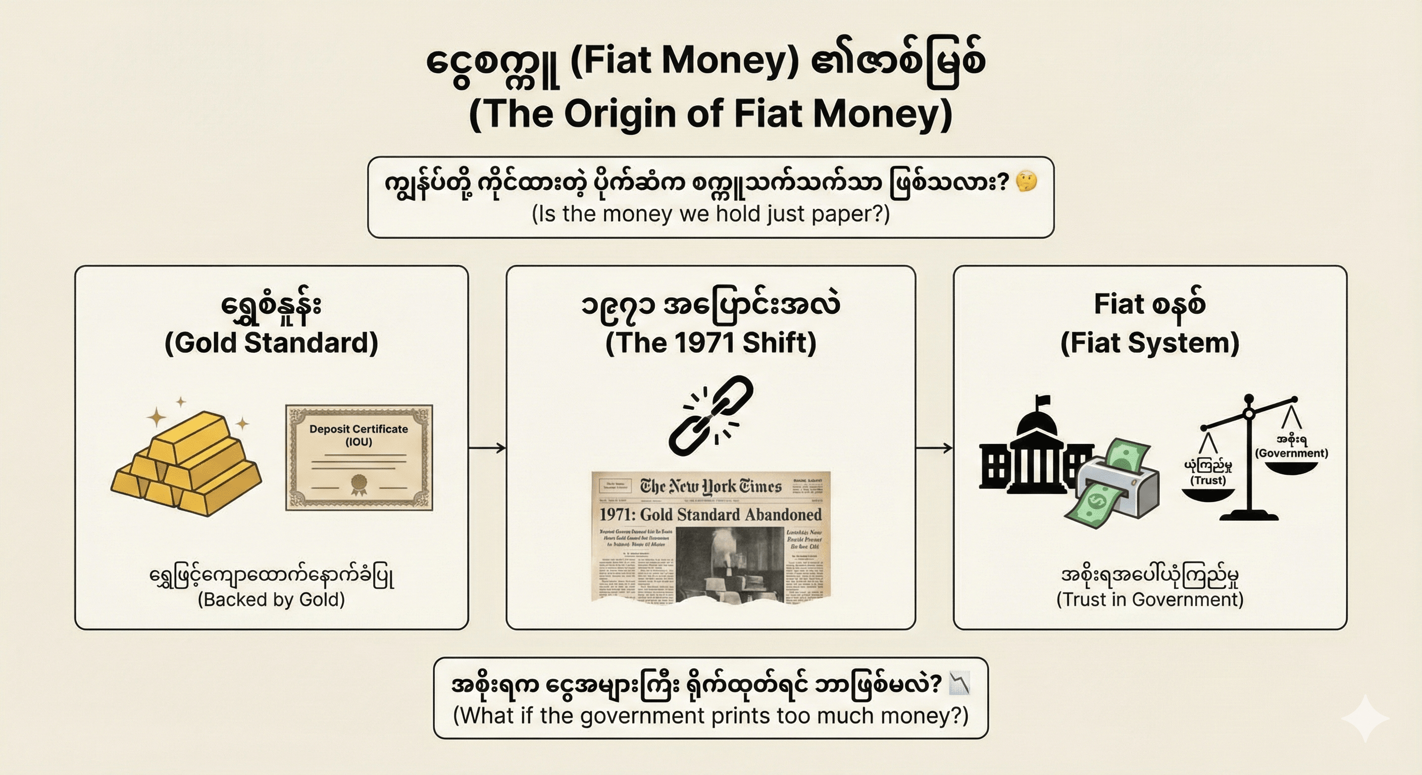 Prima del 1971, ogni dollaro era garantito da oro reale. Ma dopo il 1971, le nazioni abbandonarono lo "Standard Oro" e passarono al denaro fiat—denaro emesso dal potere e dall'autorità del governo.