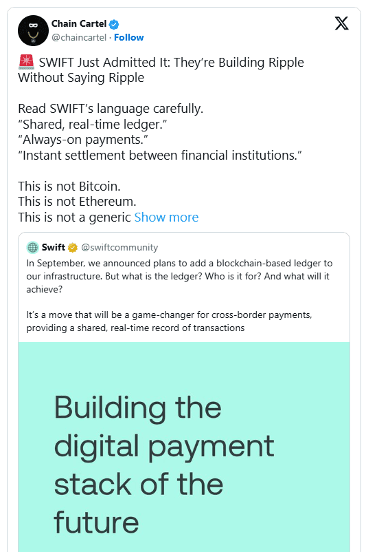 $XRP L'entusiasta Chain Cartel ha evidenziato un cambiamento chiave in come SWIFT descrive ora il futuro dei suoi pagamenti. 🔄 Invece di solo messaggistica sicura ✉️, SWIFT enfatizza: libro mastro condiviso in tempo reale 📖, liquidazione istantanea ⏱️ e pagamenti transfrontalieri 24/7. 🌎 Sempre attivi. ⚡