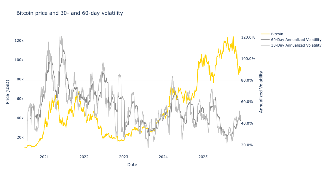 Nel 2025, la relazione tra il prezzo di bitcoin e la sua volatilità ha continuato a somigliare più da vicino alle azioni. La volatilità e il prezzo si sono mossi in modo inverso, e la vol è rimasta molto bassa durante i due eventi ATH di bitcoin nell'estate. Un "put skew" più pronunciato nei prezzi delle opzioni suggerisce che il comportamento delle opzioni ETF e DAT sta avendo una maggiore influenza. L'era dei "meltups" di bitcoin, prezzo in aumento + volatilità in aumento, potrebbe essere finita.
