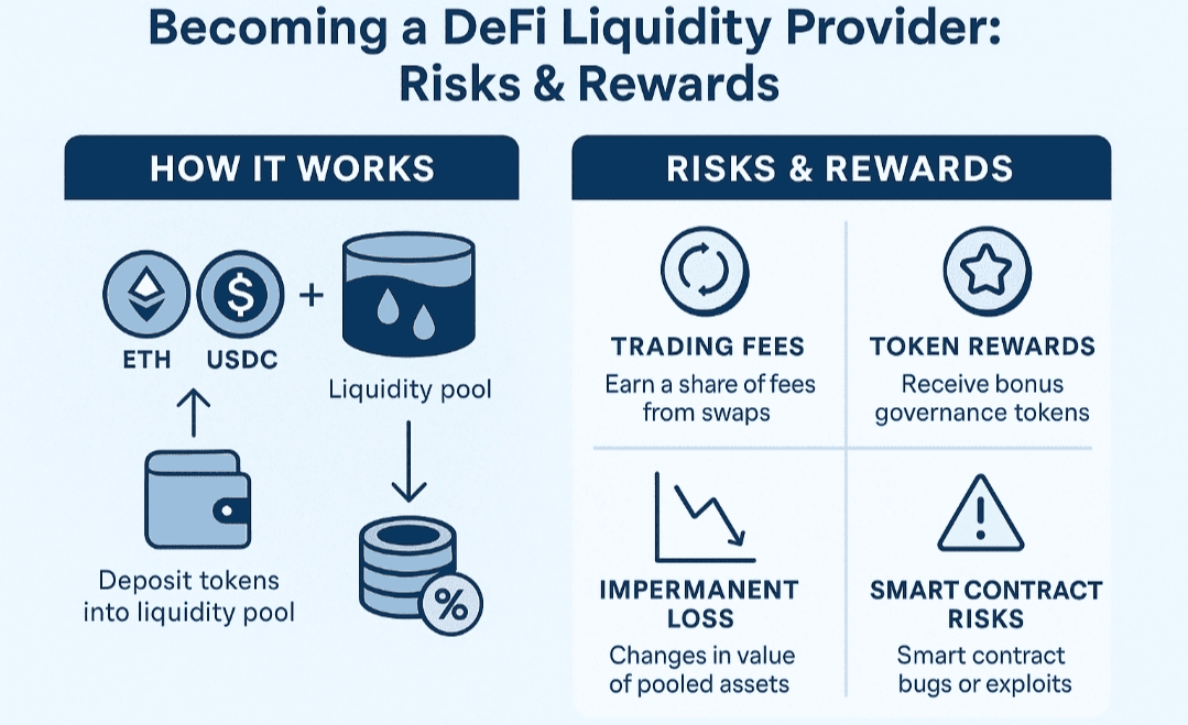La Finanza Decentralizzata ha aperto una nuova porta per gli utenti che vogliono che il loro capitale lavori oltre alla semplice detenzione o trading. Diventare un fornitore di liquidità significa mettere i propri asset in un pool di liquidità affinché altri possano scambiare senza problemi senza fare affidamento su intermediari centralizzati. Questo ruolo è fondamentale per il funzionamento dei protocolli DeFi e offre sia opportunità interessanti che serie responsabilità per chiunque vi entri.