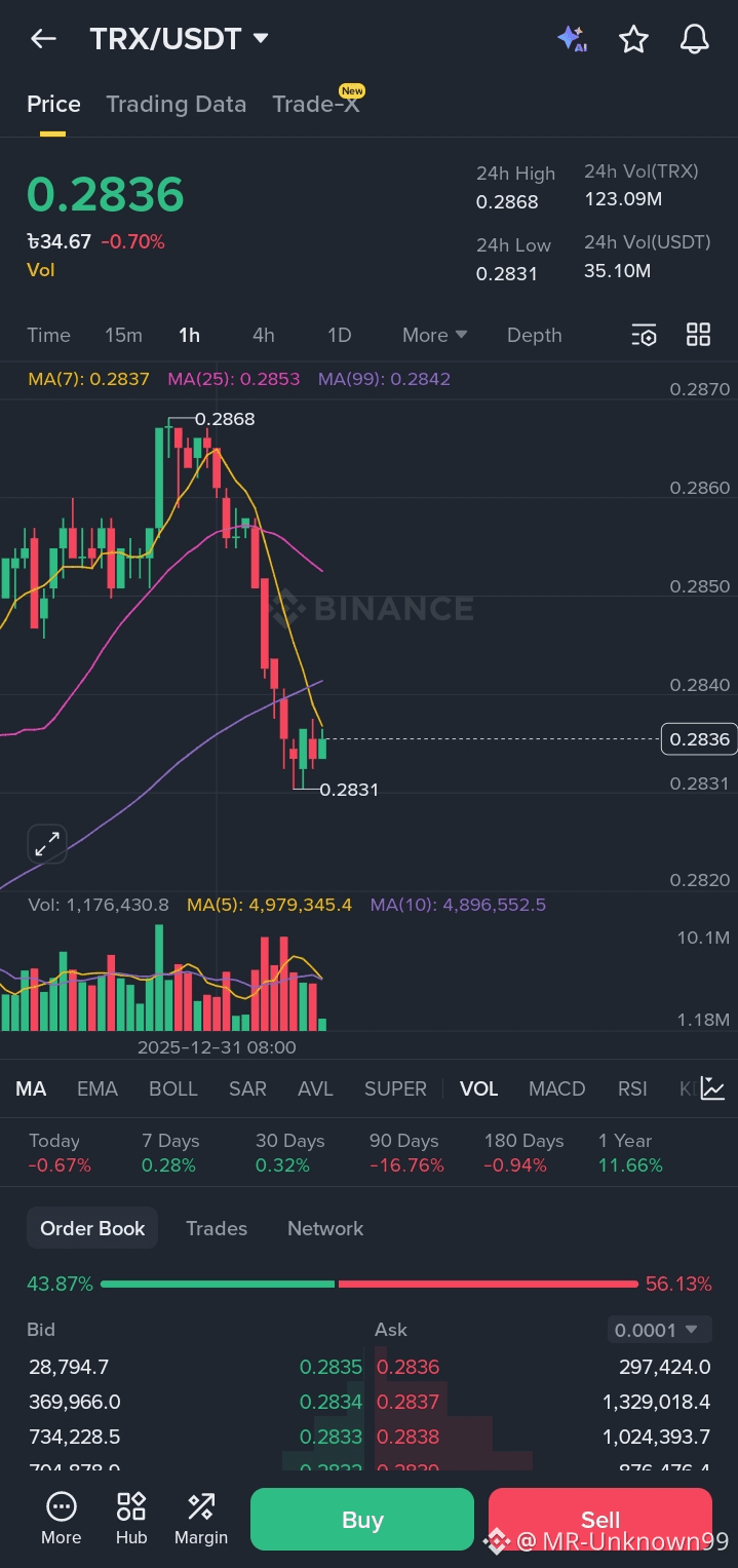 $TRX is currently trading around 0.2836 USDT after a sharp pullback from 0.2868. Price has tested the 0.2830–0.2831 support zone, showing a small bounce, but it’s still trading below key moving averages, indicating short-term bearish pressure. Volume cooled down after the drop, so a range or minor consolidation is possible. A clear hold above 0.2830 could bring a short relief move, while losing this level may open room for further downside.