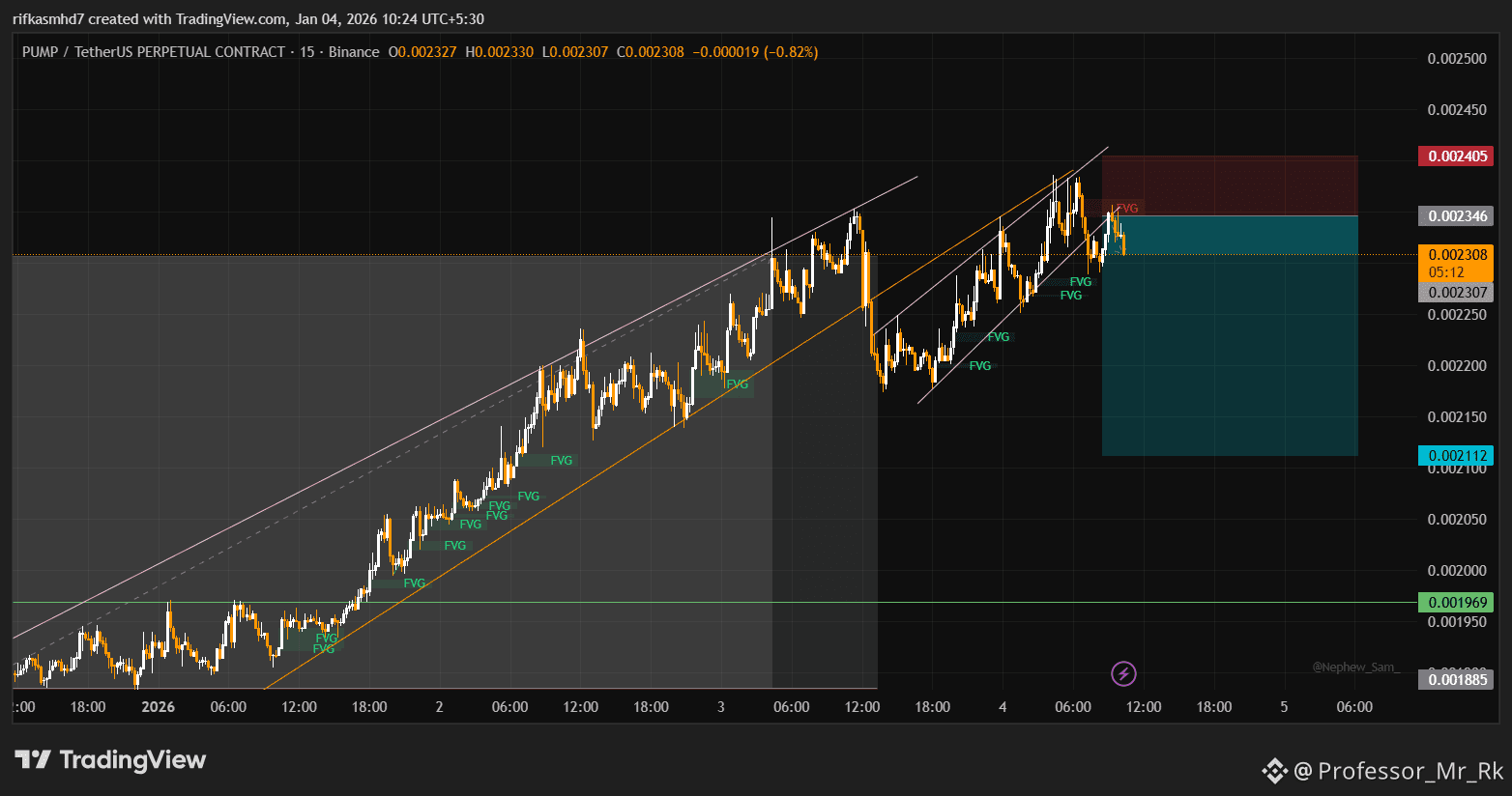 The price of PUMPUSDT has recently broken down from an established upward trend channel**. After this breakdown, it appears to be forming a new, short-term descending trend or undergoing a significant correction. The overall momentum has shifted from bullish to bearish.