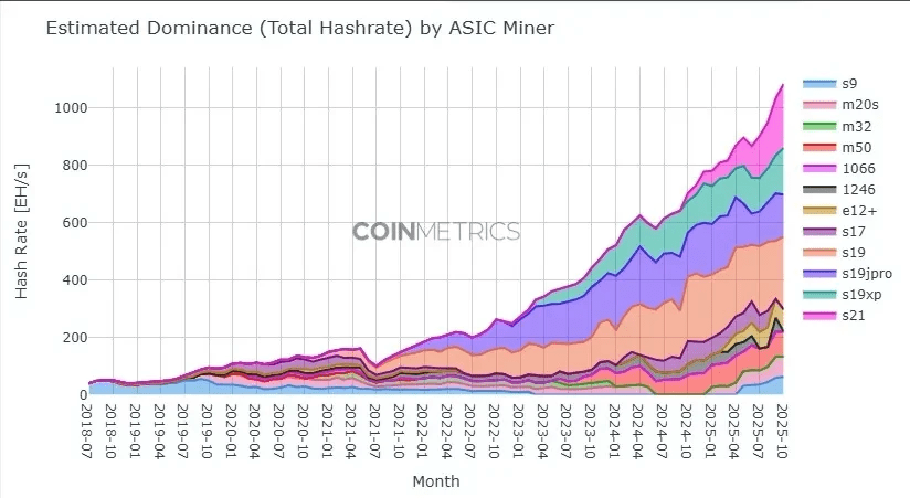 La crescita dall'inizio di gennaio è stata di circa il 25%. Secondo i dati di Coin Metrics, un contributo significativo è stato fornito dal massiccio dispiegamento di impianti della serie Antminer S21 con un'efficienza energetica di 13-16,5 J/TH a seconda della modifica. La loro quota nell'hash rate totale ha raggiunto circa il 20% entro ottobre.