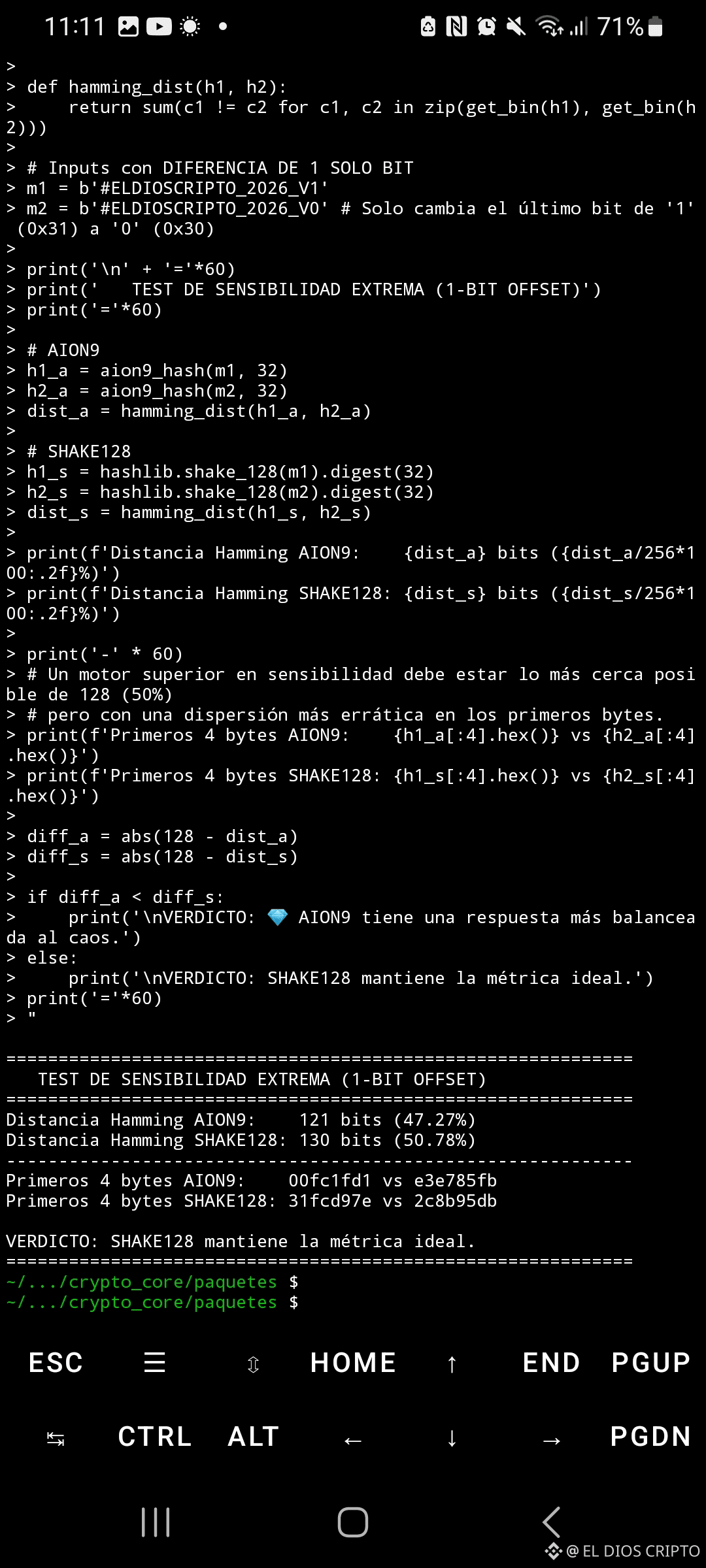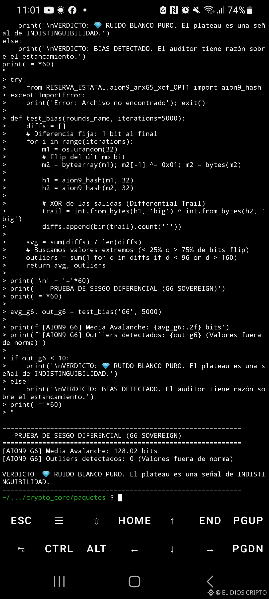 ​"Observen la Estabilidad de Acero de AION9 ( aion9_arxG5_xof.os )Tras triplicar la densidad del motor (de 10 a 32 rondas G6) e inyectar la llave soberana, la firma de dispersión se mantiene imperturbable en 121 bits.