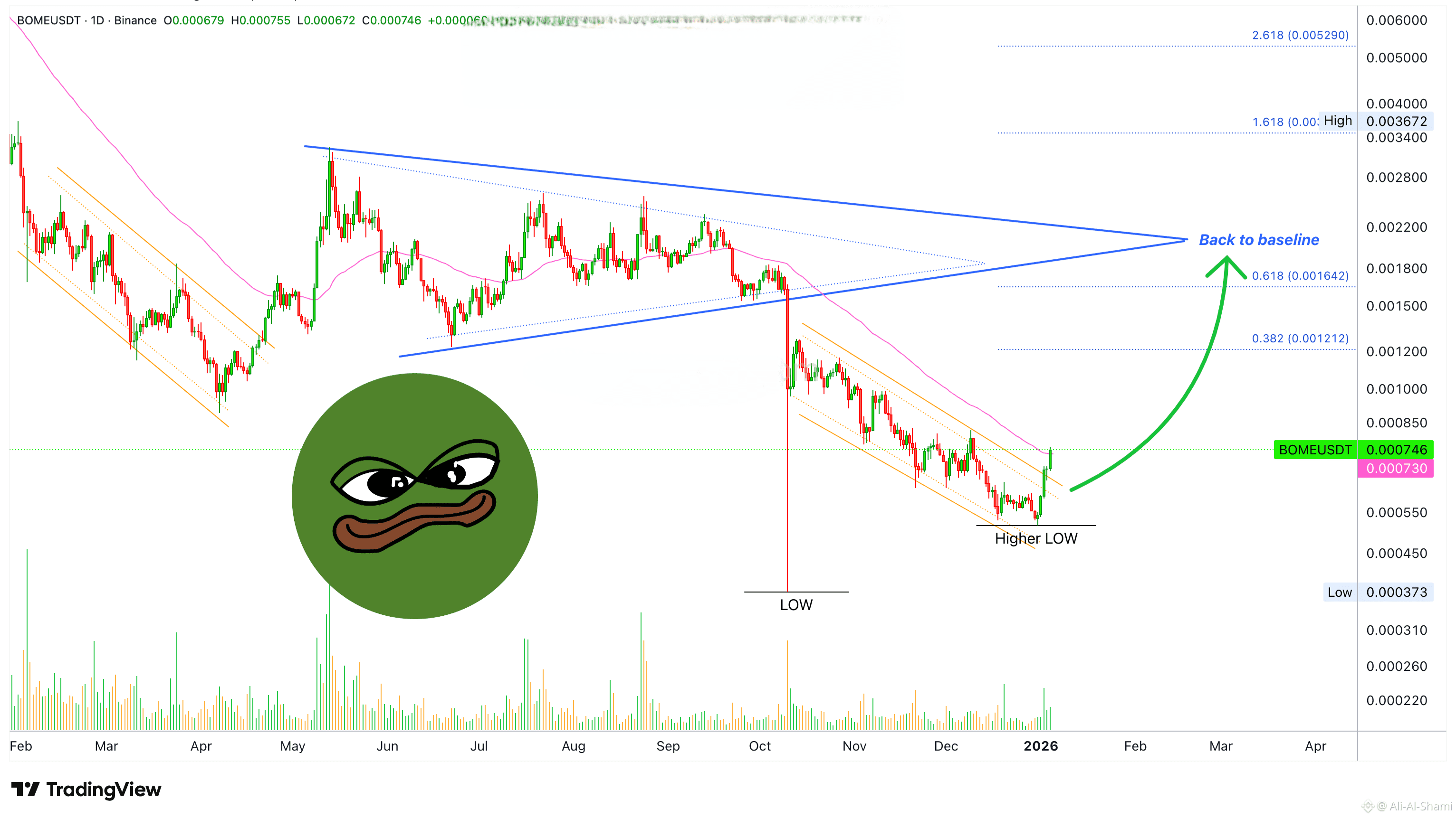 BOME تتحرك - للتو - فوق EMA55 على الإطار الزمني اليومي. الحركة مؤكد فقط بمجرد إغلاق الشمعة اليومية. يحدث النمو فوق هذا المستوى. بمجرد أن يغلق BOMEUSDT فوق EMA55، نحصل على نمو إضافي وسريع بناءً على الحركة في السوق، ما نراه عبر سوق العملات البديلة.
