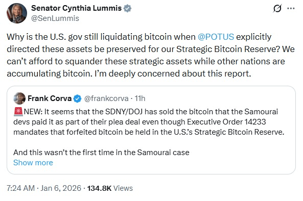 In un colpo deciso che ha scosso Washington, il senatore Lummis critica le tattiche dell'Ufficio del Procuratore Generale per la vendita di Bitcoin, accusando gli organismi federali di agire apparentemente al di fuori degli ordini attuali della Casa Bianca.