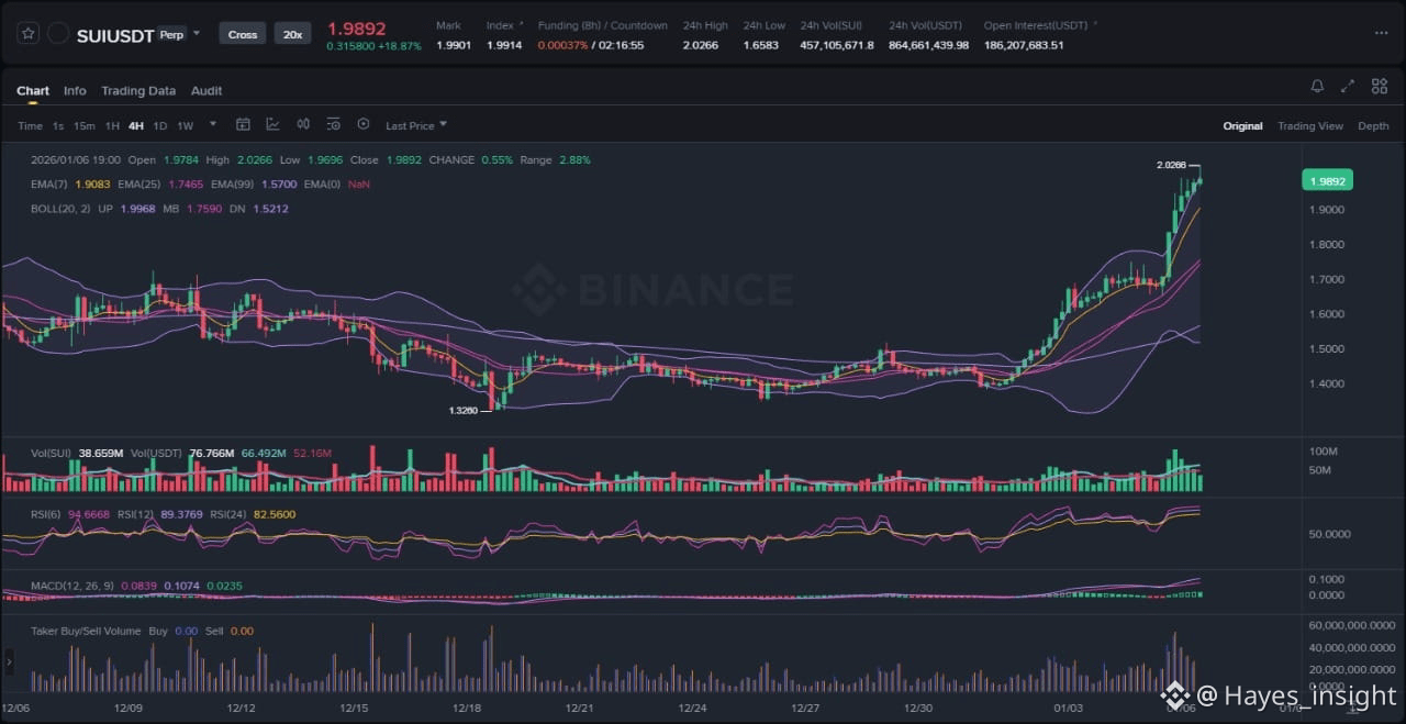 Examining the attached chart on the SUI/USDT pair, the current structure indicates a confirmed breakout from a multi-month ascending triangle pattern, transitioning from range-bound consolidation to an uptrend. The price has surged above key moving averages, with the 7-period EMA crossing bullishly over the 25-period EMA, and both now positioned above the 99-period EMA, confirming bullish alignment. Bollinger Bands show expansion in volatility, with the price hugging the upper band after a sharp impulsive move from the December lows, indicating sustained buying pressure rather than mean reversion. Observable elements include a local swing low at 1.40, followed by a rejection of lower band support and a volatility expansion candle that broke through the 1.80 resistance, now acting as support. There's also evidence of consolidation just below the recent high of 1.95, forming a flag pattern that suggests continuation potential.