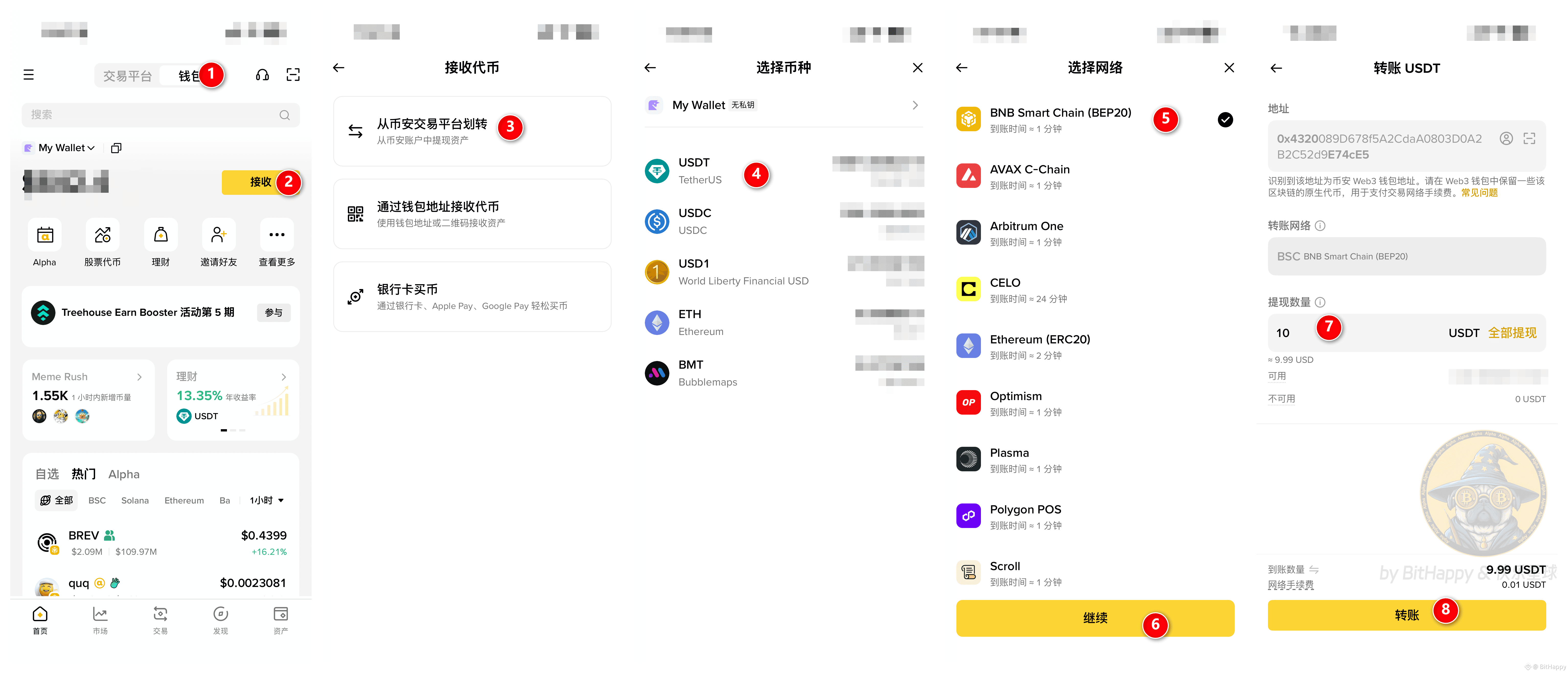 APP → 钱包 → 接收 → 从币安交易平台划转 → USDT → BNB Smart Chain(BSC)→ 继续 → 输入提现数量 → 转账 → 确认