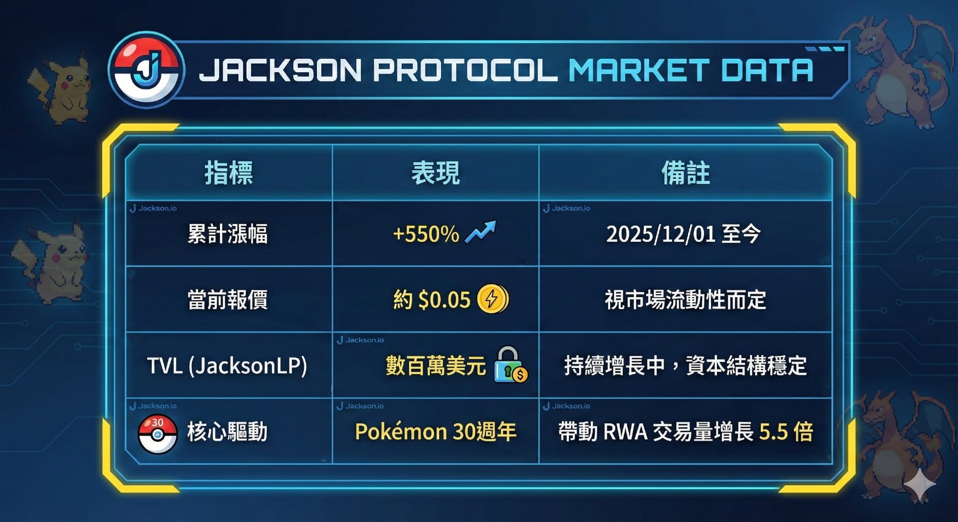 Mentre tutti i giocatori in tutto il mondo si affannano a cercare carte fisiche, i fondi intelligenti si sono già riversati nel progetto sorpresa dell'ecosistema Sui — $JACKSON. In breve tempo, il guadagno cumulativo ha superato il 550%, con un aumento del 430% in un solo mese! Si tratta di nostalgia o di una vera e propria chiave del successo finanziario? Scopriamo insieme questa 'tempesta dei Pokémon' che sta travolgendo il mondo delle criptovalute.