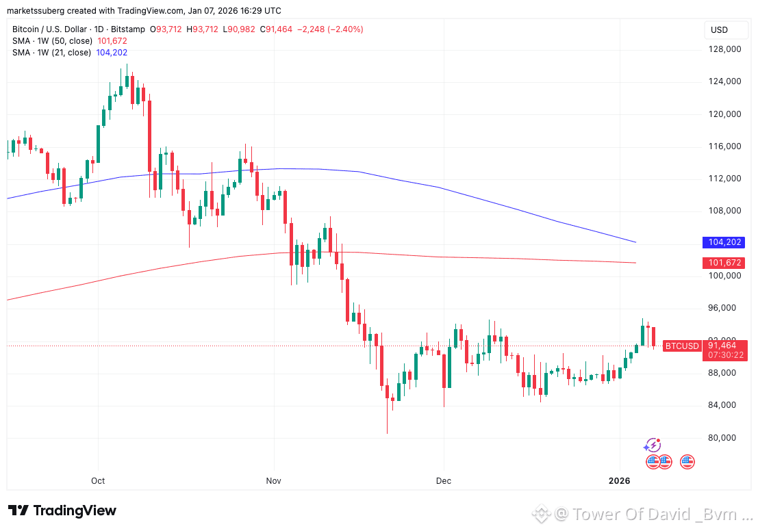 For a true turnaround, one-week relative strength index (RSI) values above 41/100, along with weekly closes above the 50-week SMA at $101,500, are needed.