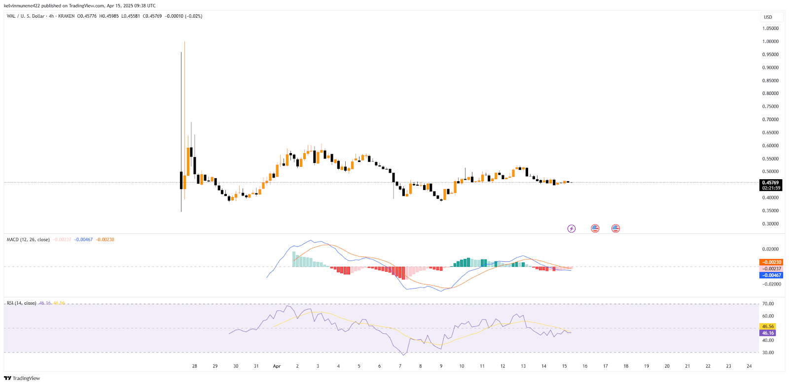 Secondo il grafico a 4 ore, la linea MACD di WAL rimane al di sotto della linea di segnale, indicando una tendenza ribassista prevalente nel mercato. Sebbene le barre dell'istogramma mostrino una forza in diminuzione, sono ancora negative, indicando un indebolimento della tendenza ribassista.