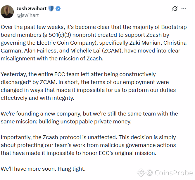 The drama unfolded on January 7 when ECC CEO Josh Swihart announced that every employee had left the company, describing it as a “constructive discharge” due to irreconcilable governance conflicts with the Bootstrap nonprofit board overseeing ECC. Swihart accused certain board members of actions that made it impossible for the team to continue their work effectively, while stressing that this wasn’t an abandonment of Zcash’s mission. Instead, the departing devs plan to form a new independent company to keep building privacy tech—potentially without the bureaucratic shackles.