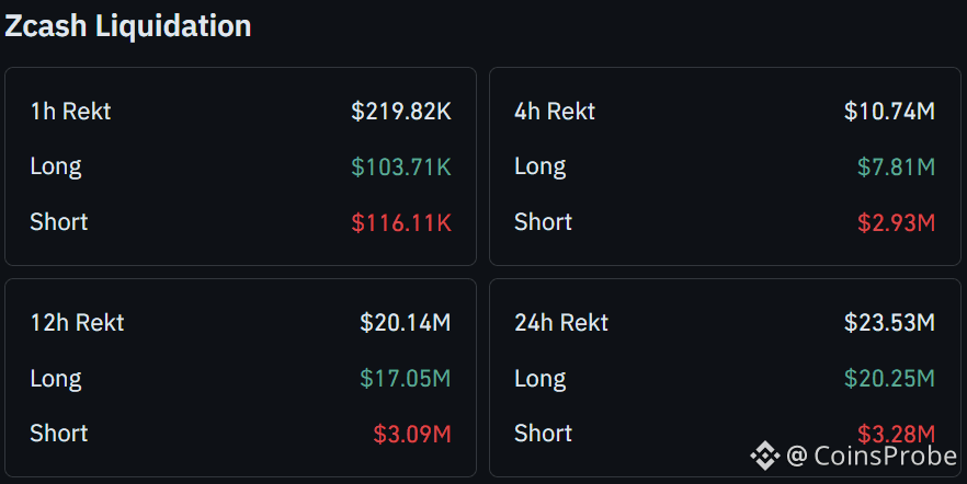 The sell-off triggered a cascade of forced liquidations in the futures market. According to CoinGlass data, Zcash saw $23.53 million in total liquidations over the past 24 hours—with longs getting absolutely wrecked at $20.25 million, while shorts only faced $3.28 million. This heavily lopsided liquidation skew shows how overleveraged bulls were caught flat-footed, fueling further downside as positions got forcibly closed.
