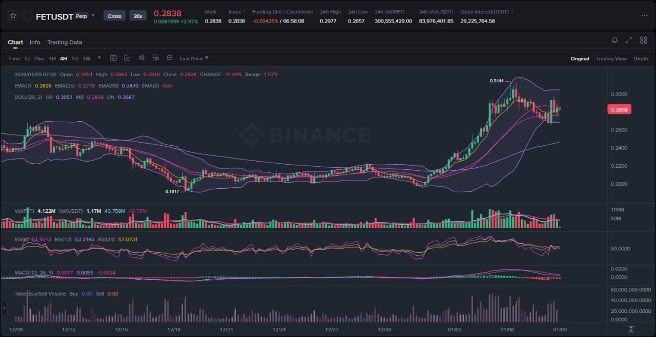 Esaminando più a fondo le sfumature del grafico, il periodo di consolidamento prima della rottura ha presentato intervalli ristretti tra 0,22 e 0,25, indicativi di accumulo da parte di capitali intelligenti prima della gamba impulsiva verso l'alto. I massimi swing locali di novembre ora servono come potenziali sweeps di liquidità, dove il prezzo ha brevemente toccato questi livelli per attivare stop prima di invertire verso l'alto, un segnale classico di posizionamento istituzionale. La volatilità, misurata dalla larghezza delle bande, è aumentata del 25% dai minimi di dicembre, suggerendo che il mercato sta prezzando un'incertezza maggiore ma con un bias direzionale verso l'alto. Se la 99 EMA a circa 0,23 agisce come un pavimento solido, potrebbe prevenire ritracciamenti più profondi, consentendo un movimento misurato verso l'estensione prevista del canale. Complessivamente, l'impostazione tecnica posiziona FET in una fase di tendenza rialzista ad alta convinzione, con la validità della rottura che dipende da chiusure sostenute sopra 0,26.