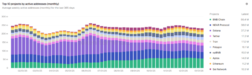 Mentre i grandi istituzionali forniscono il livello di base, l'engagement dei piccoli investitori all'interno dell'ecosistema BNB Chain fornisce l'impulso per superare i limiti. Secondo Token Terminal, la BNB Chain ha mantenuto un vantaggio impressionante nell'attività degli utenti, con una media di 56,4 milioni di indirizzi attivi settimanali all'inizio del 2026. Per dare un'idea, questo numero supera di gran lunga i concorrenti come Solana (37,2 milioni) ed Ethereum (11,2 milioni). Questa tendenza costante di crescita nell'attività on-chain indica che gli operatori retail sono profondamente integrati nei protocolli DeFi e di gioco dell'ecosistema, creando una domanda costante e fondamentale per BNB che rimane svincolata dalle fluttuazioni di prezzo a breve termine.