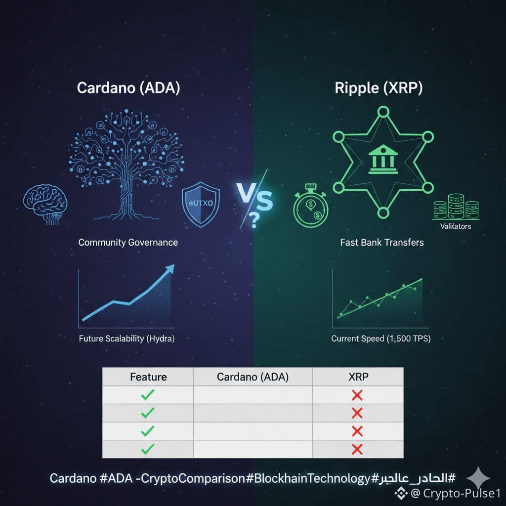 إذا نظرنا إلى العملات الرقمية كـ "دول رقمية"، فإن XRP تشبه شركة كبرى تقدم خدمات تقنية للمؤسسات، بينما ADA تشبه دولة ديمقراطية متكاملة ذات دستور برمجى غير قابل للتلاعب.