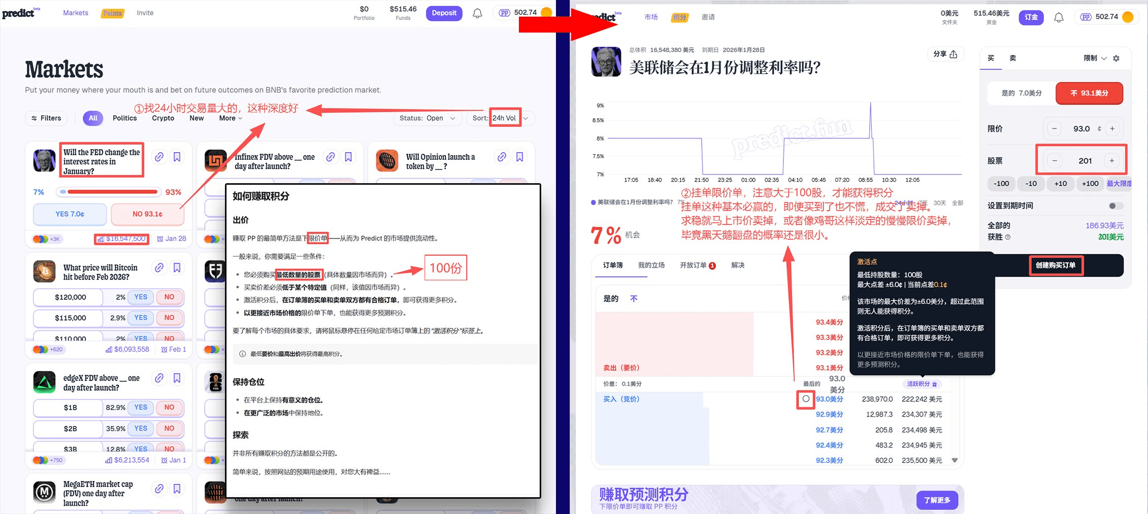 La presentazione di predict.fun è già stata inviata in precedenza; oggi ne approfondiamo ulteriormente la strategia per guadagnare punti. Se si vuole ottenere punti senza investire, l'importante è posizionare ordini a prezzo limite e attendere l'esecuzione.