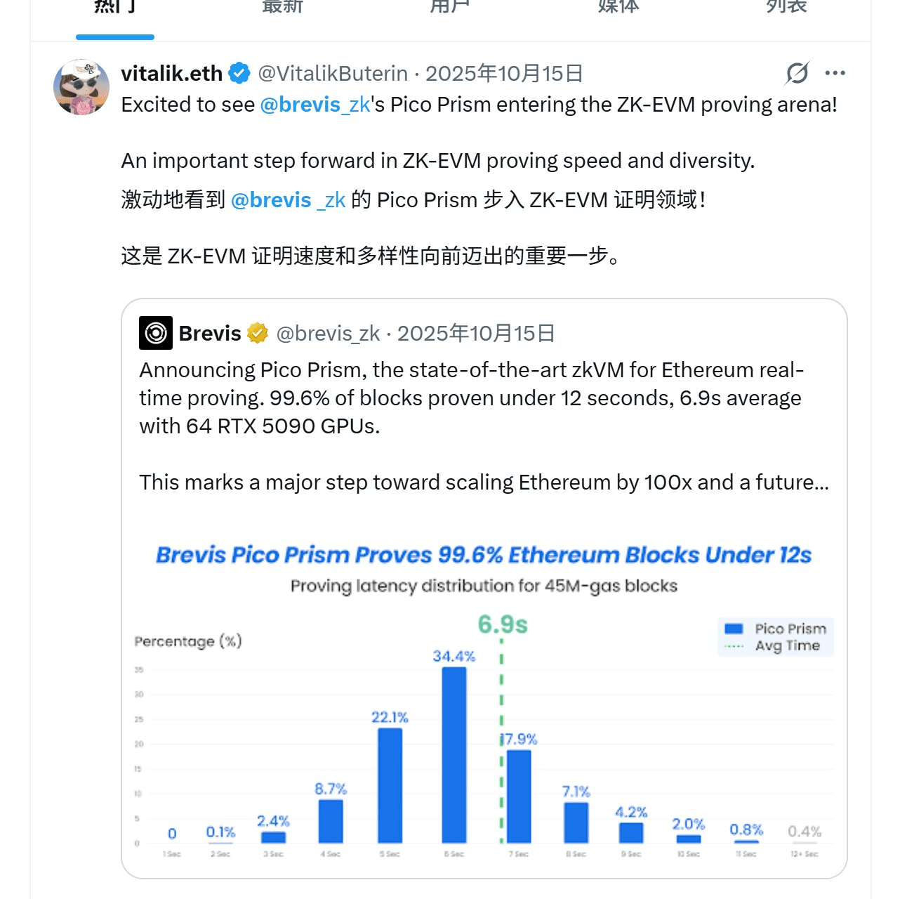 Ad esempio, V神 ha precedentemente menzionato specificamente le prestazioni del ZK-VM di Brevis e ha espresso l'aspettativa che entrino nel campo del ZK-EVM.