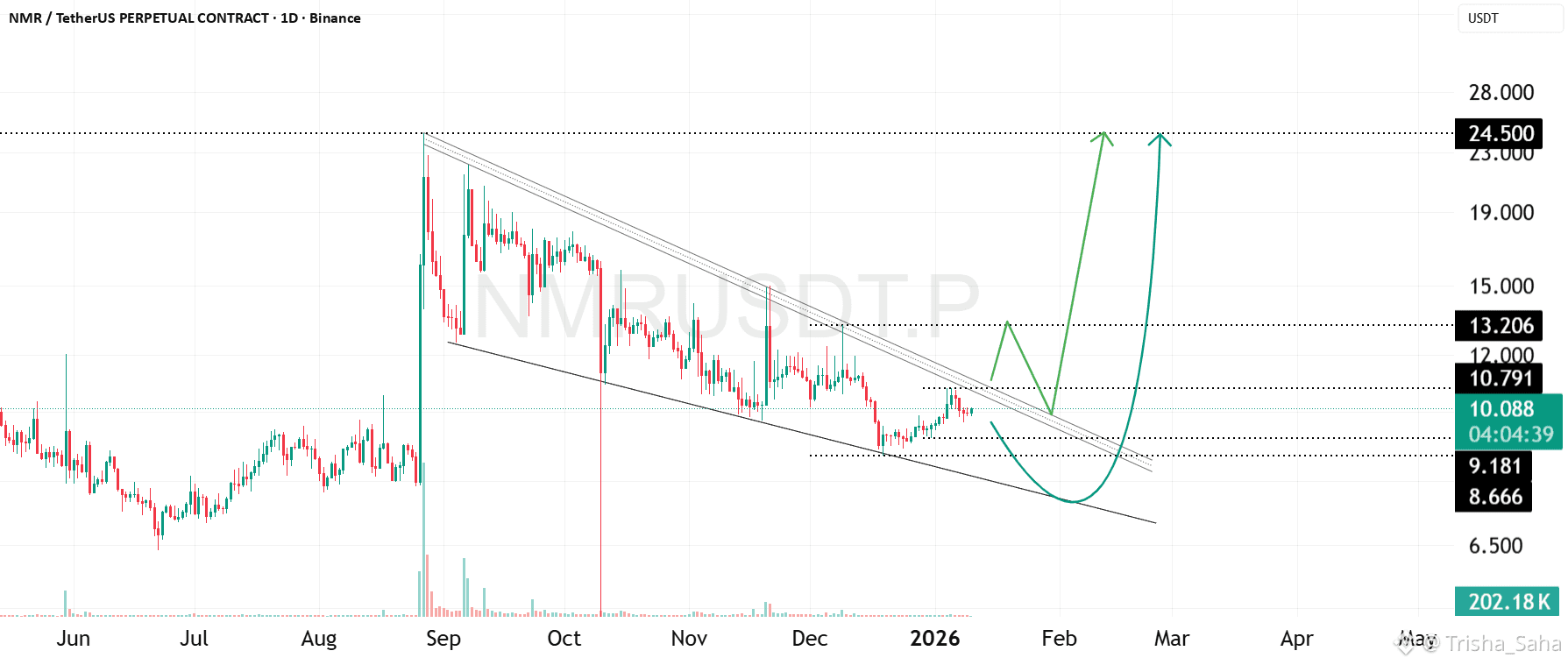 Price is currently holding the 8.66–9.18 demand zone while pressing toward wedge resistance around 10.7–10.8. A confirmed breakout and acceptance above the wedge resistance would indicate a momentum shift, targeting 13.20 initially, with a larger upside extension toward the macro resistance near 24.50.