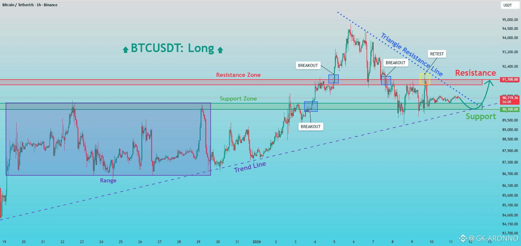 BTCUSDT previously traded inside a well-defined range, where price moved sideways for an extended period, indicating balance and accumulation between buyers and sellers. This consolidation phase ended with a clean breakout to the upside, confirming a shift in market control toward buyers. Following the breakout, price respected a rising trend line, forming higher highs and higher lows, which validated a bullish market structure. As BTC continued higher, it reached a key Resistance Zone around 91,700, where selling pressure appeared. Price reacted from this area and pulled back, but the move remained corrective rather than impulsive. During the pullback, BTC found support at the Support Zone near 90,100, which aligns with previous breakout structure and the rising trend line. At the same time, price is trading below a descending triangle resistance line, suggesting compression and preparation for a directional move.