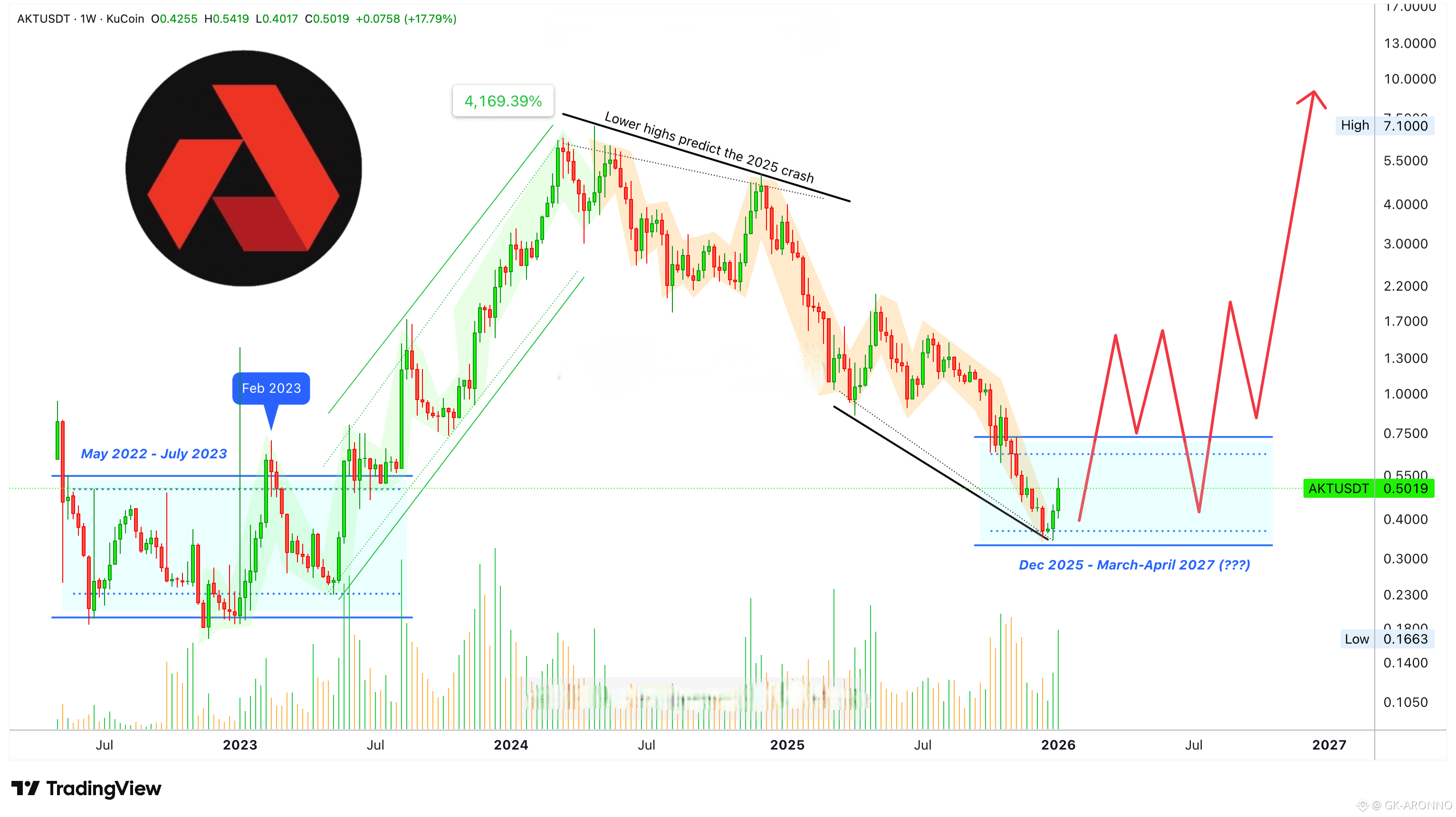 This scenario that I am depicting on the Akash Network chart can be valid for many altcoins. Notice the action between May-June 2022 through July 2023âleft side of the chart. Something similar can happen at the start of 2026.