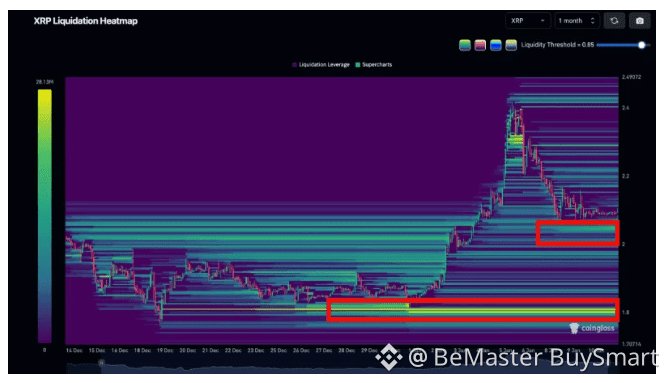 👉 There's this thick band of liquidity down around $1.80 where XRP was stuck grinding sideways through late December. That zone lit up the heatmap with dense horizontal activity—tons of leverage piled up there over time. Once price broke above it in early January, things got moving fast. That's textbook behavior when markets clear out concentrated leverage and finally get room to breathe.