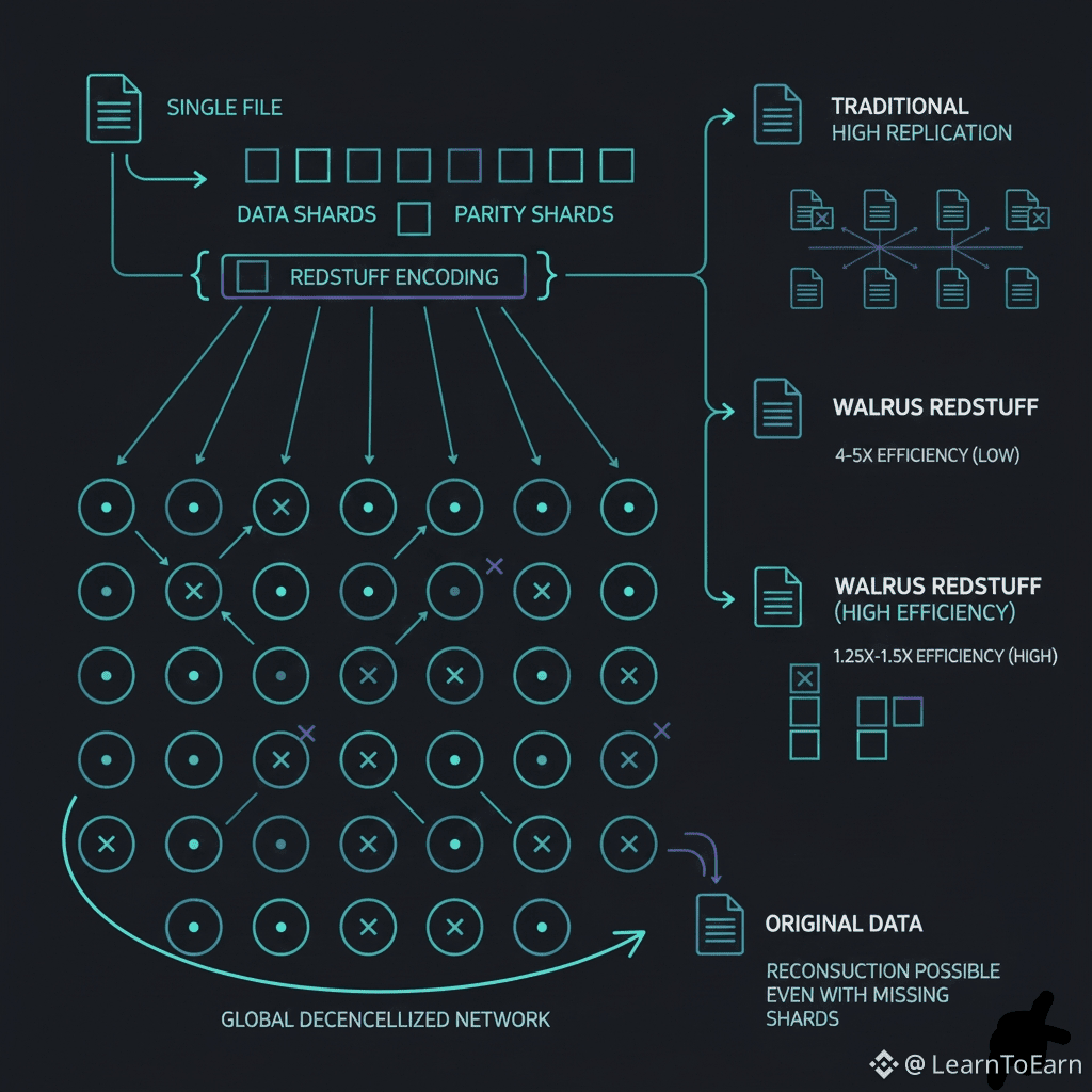 At the heart of Walrus is RedStuff, a proprietary two-dimensional erasure coding scheme . Instead of simply copying a file multiple times (full replication), RedStuff breaks data into smaller pieces, encodes them with redundancy information, and distributes these "shards" across a global network of independent storage nodes .
