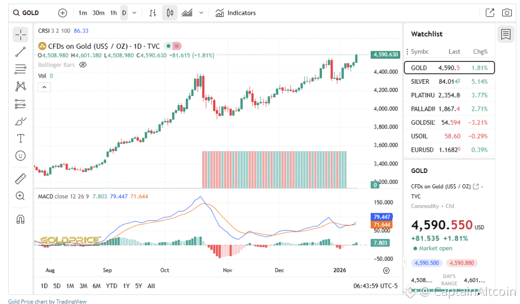 Gold’s move above $4,600 marks another decisive leg higher in a rally that has been building for months. Silver’s strength adds confirmation, as silver often lags gold before catching up quickly when momentum accelerates. Together, the two are sending a clear message about risk appetite and capital rotation.