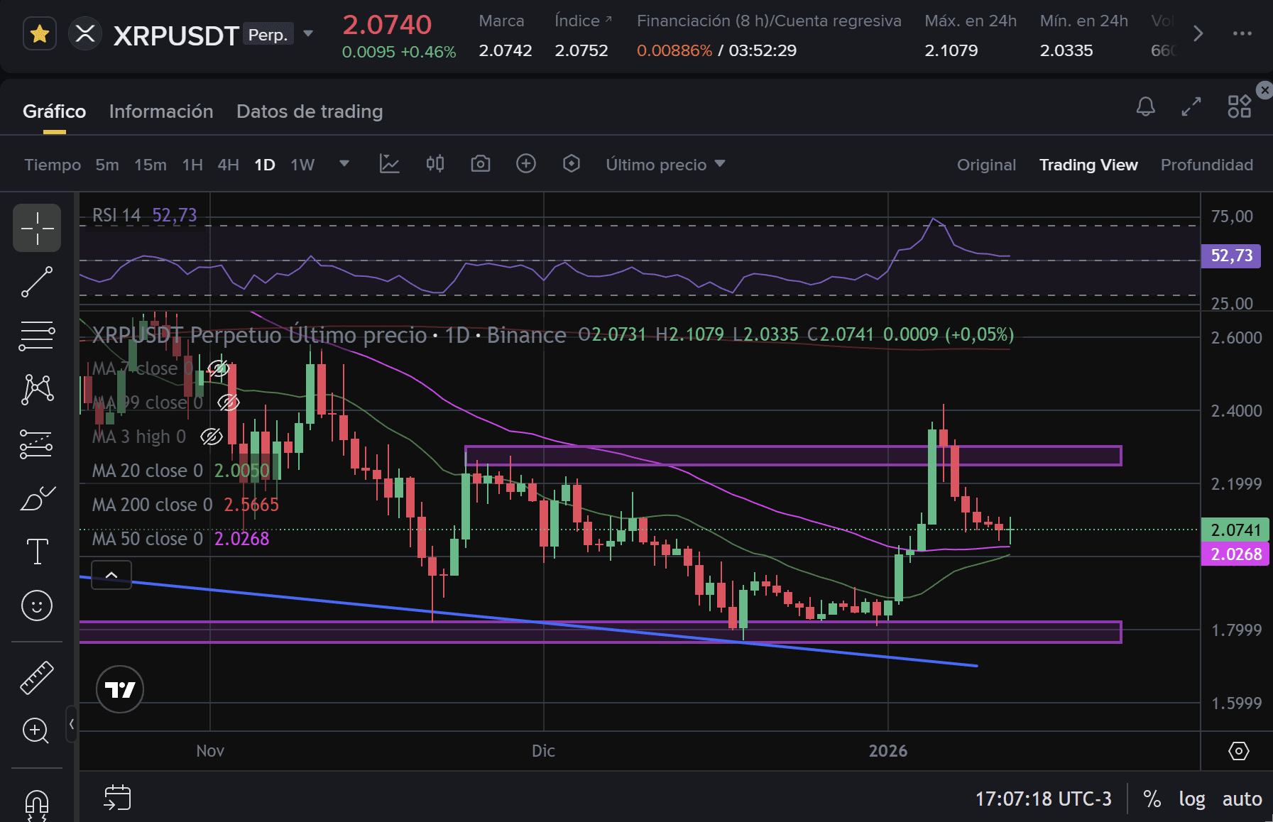 XRP dimostra una forza fondamentale a lungo termine grazie agli avanzamenti regolatori del 2026, ma soffre di un'"anemia" di liquidità a breve termine. Gli indicatori tecnici neutri (RSI 52) ci dicono che il prossimo movimento forte dipenderà da chi vincerà la battaglia dei 2,00 $: se i detentori istituzionali difenderanno la zona o se le uscite di capitale provocheranno una correzione maggiore.