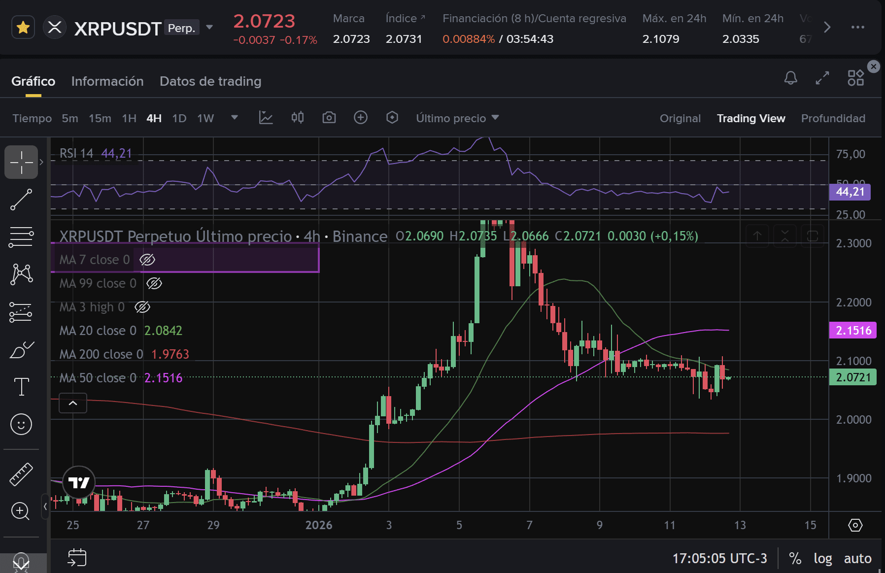 Su 4H: vediamo una lotta chiara. Il prezzo (2,07 $) è intrappolato proprio sotto la MA 20 (linea verde a 2,084 $), che agisce come resistenza immediata, ma si mantiene supportato dalla MA 200 (linea rossa a 1,976 $). Perdere la zona di 1,97 $ sarebbe un segnale tecnico molto negativo.