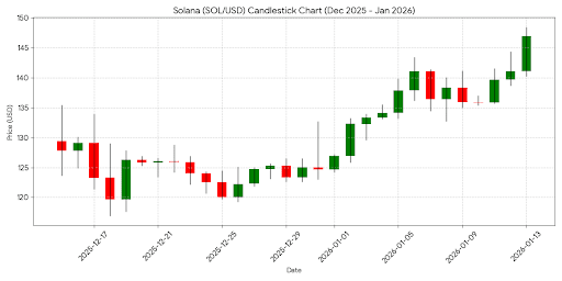 Il seguente grafico a candele illustra l'andamento del prezzo di Solana dal mezzo dicembre 2025 fino al 13 gennaio 2026, catturando il recente recupero e il tentativo di superare la resistenza di \$145.
