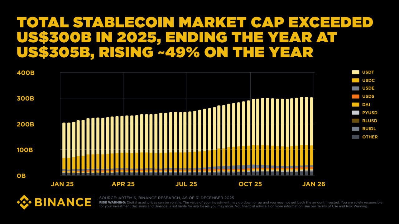 🟥La capitalizzazione di mercato delle stablecoin ha superato i 300 miliardi di dollari con una crescita annuale del 49%