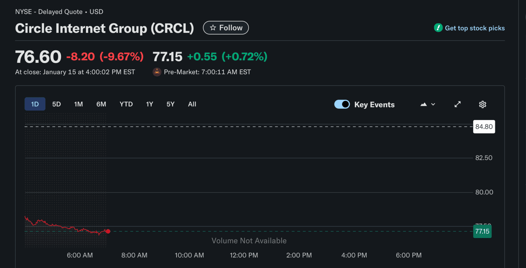 Il prezzo delle azioni di Circle è anche sceso del 9% secondo Yahoo Finance, seguendo la tendenza del mercato.