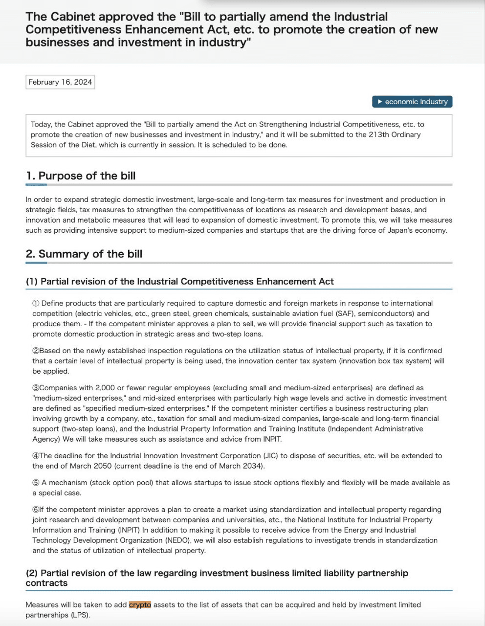 Japanese government approves bill that permits Investment Limited Partnerships to acquire and hold crypto ๐๐