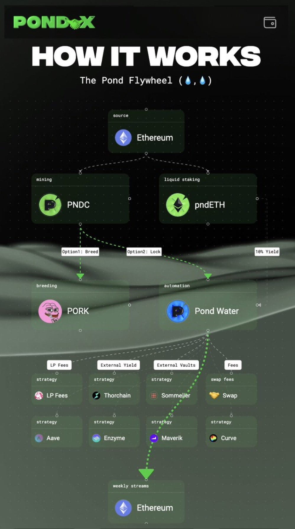 Al centro dell'ecosistema di Pond0x c'è l'innovativo meccanismo Pond Flywheel, dove tutto inizia con Ethereum come fonte primaria. Da questa fonte, si dispiegano una serie di mosse strategiche, progettate per massimizzare il rendimento e garantirne il ritorno ai partecipanti. Ecco come funziona: