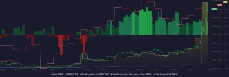 I dati di Santiment rivelano inoltre che oltre l’89,5% dell’offerta totale di FLOKI è attualmente in profitto. Questa elevata redditività aumenta la possibilità di significative prese di profitto da parte delle balene, il che potrebbe portare a un raffreddamento