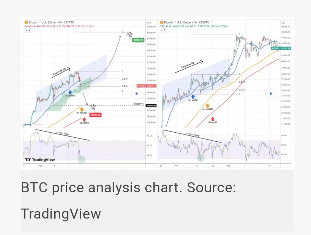 Finché la MA50 a 1D (linea rossa del trend) si mantiene, possiamo aspettarci un'inversione rialzista e un aumento verso un altro ATH più vicino alla fine del mese o, nel peggiore dei casi, nella prima settimana di aprile, ha scritto Trading Shot. L'esperto di trading ha sottolineato la discrepanza tra il modello attuale e dicembre 2022 non solo nei movimenti di prezzo e nelle medie mobili (MA), ma anche nelle sequenze dell'indice di forza relativa (RSI), il che rafforza la fiducia in una continuazione rialzista. Il lato debole del bitcoin è che lo stesso analista ha avvertito che una rottura del canale ascendente potrebbe portare a un potenziale calo fino a $60.000, che coinciderebbe con il test della MA200 a quattro ore. Per quanto riguarda il futuro del bitcoin, gli investitori dovrebbero prestare attenzione ai seguenti livelli di prezzo nel prossimo futuro: l'intervallo da $64.750 a $66.700 rimane un supporto chiave al momento, e in caso di perdita di questo, gli investitori dovrebbero preoccuparsi di un abbassamento a $60.760-62.790.