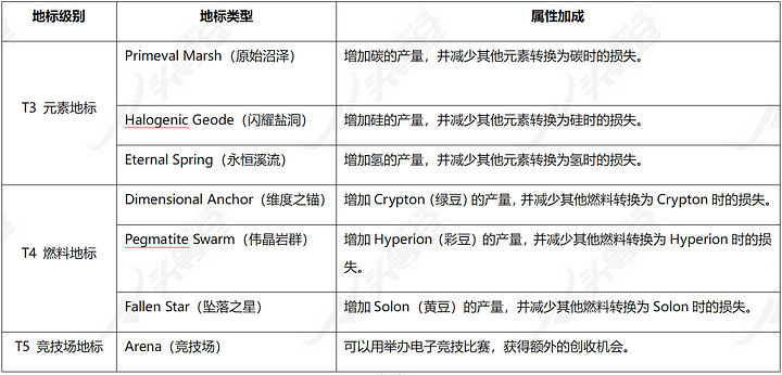 Il terreno pagato da Zero è diviso in 5 livelli, per un totale di 100.000 pezzi. Attualmente, nel primo lotto di vendite di terreni sono stati venduti 19.969 pezzi di terreno. Diversi livelli di terreno rappresentano diversi gradi di rarità. Più il terreno è raro, più risorse può produrre e maggiore è il bonus di produzione delle risorse. Allo stesso tempo, i terreni T3, T4 e T5 hanno anche bonus speciali unici (punti di riferimento) e Funzione, il prezzo corrispondente è più caro Attualmente i terreni dal T1 al T4 possono essere acquistati sul mercato IlluviDex, mentre i terreni dal T5 si ottengono solo tramite asta. Inoltre, poiché il numero e la posizione dei minerali elementali e dei minerali combustibili sono distribuiti in modo casuale, alcune terre potrebbero trovarsi ad affrontare una situazione di eccesso di un minerale e insufficienza di un altro, quindi i giocatori devono scegliere strategicamente terre più bilanciate da acquistare. Inoltre, anche la posizione del giocatore nell'intera mappa avrà un certo impatto sullo sviluppo del territorio. In futuro, se un giocatore possiede più terre adiacenti contemporaneamente, queste terre potranno realizzare uno scambio di risorse e essere unificate. creare un effetto di scala.