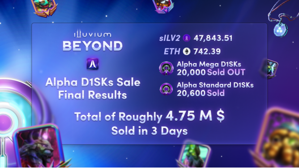 Un totale di 20.000 Alpha Mega D1SK e 20.600 Standard Alpha D1SK sono stati venduti nel primo round di vendite di D1SK Alpha, con un fatturato totale di circa 47.844 sILV2 e 742 ETH, equivalenti a circa 4,75 milioni di dollari. Successivamente, Illuvium ha avviato diversi round di promozioni D1SK. includere: