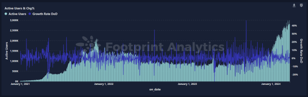 Da quando il mercato è entrato in un nuovo mercato rialzista alla fine del 2023, il percorso di gioco a catena ha raggiunto una crescita significativa ed è diventato uno dei principali percorsi che guidano l’ascesa di questo mercato rialzista. Dai dati si evince che il circuito dei giochi a catena sta vivendo il secondo periodo di rapida crescita dalla fine del 2021. Il numero di giocatori di giochi a catena sta crescendo rapidamente. Al suo apice, il numero di utenti attivi ha superato i 3 milioni, con transazioni attive e partecipazione entusiasta al mercato. Se stimato in base al tasso di fidelizzazione dei giocatori durante l'ultimo ciclo di rapida crescita, dopo la fine di questo periodo di crescita, il gruppo di utenti principali dei giochi a catena rimarrà al di sopra di 2,5 milioni, che è vicino al numero di gruppi di giocatori principali in fondo del turno precedente del mercato tre volte. Ciò significa che in futuro ci sarà molto spazio per la crescita nell’intero circuito dei giochi blockchain e potrebbero emergere altri progetti importanti.