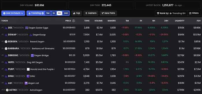 Nei giorni successivi il DEGEN ha continuato a salire. Il 1° aprile DEGEN ha superato brevemente quota 0,06 USD, triplicando rispetto a una settimana fa. Ciò è stato seguito da una frenesia di speculazioni sull’ecosistema della catena Degen. Durante il fine settimana, il prezzo dei token all'interno dell'ecosistema Degen Chain è generalmente aumentato, con il token DSWAP della piattaforma DEX dell'ecosistema Degen, DegenSwap, che è aumentato del 465% in 24 ore. DINU, un meme token, è aumentato del 194% e PURP è aumentato del 67%. Secondo i dati di Dexscreener, Degen Chain ha raggiunto un volume di scambi giornalieri di oltre 80 milioni di dollari in meno di una settimana dal suo lancio, con 270.000 transazioni in 24 ore.